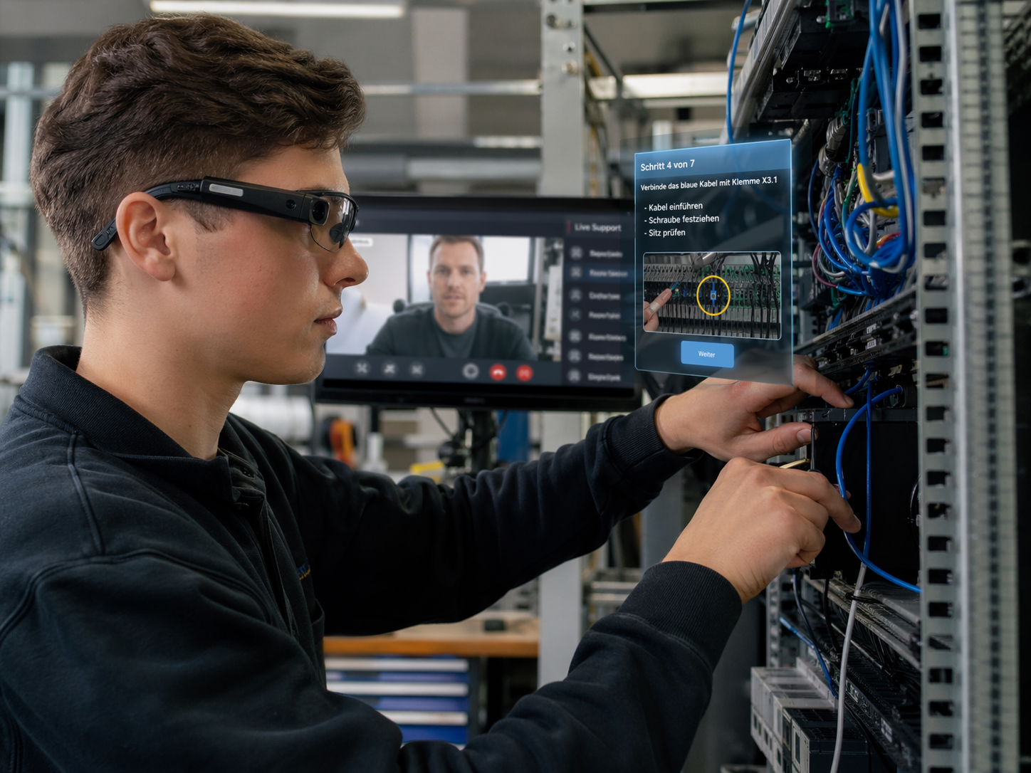 Für freihändige Schrittführung, Sicht auf Maschinen, Fernhilfe und kontextbezogene Hinweise im Arbeitsfluss.