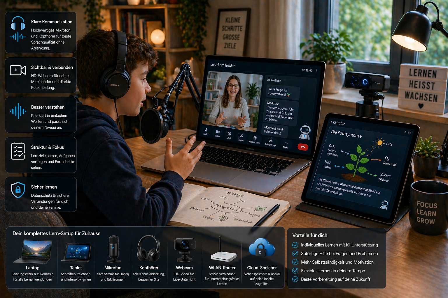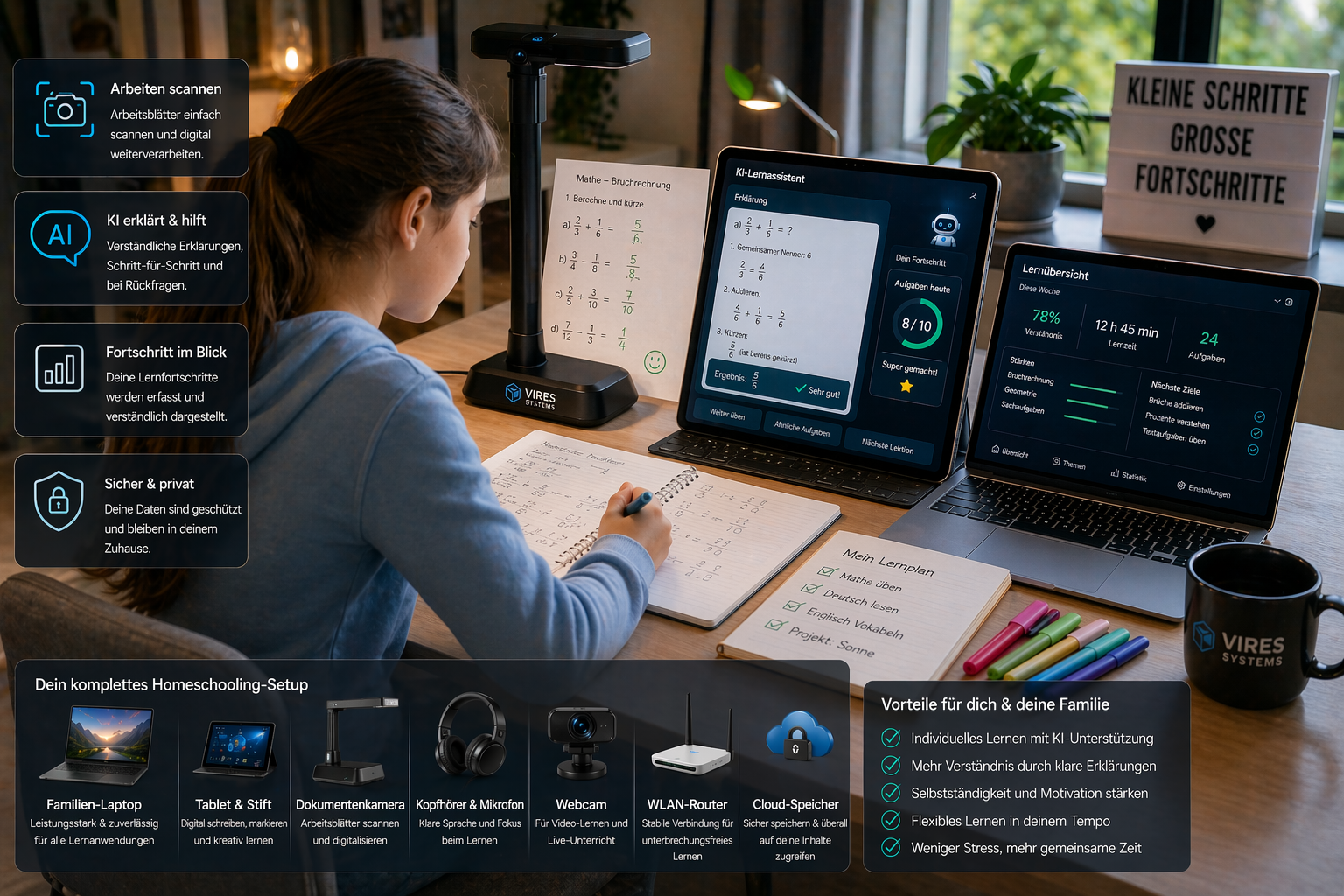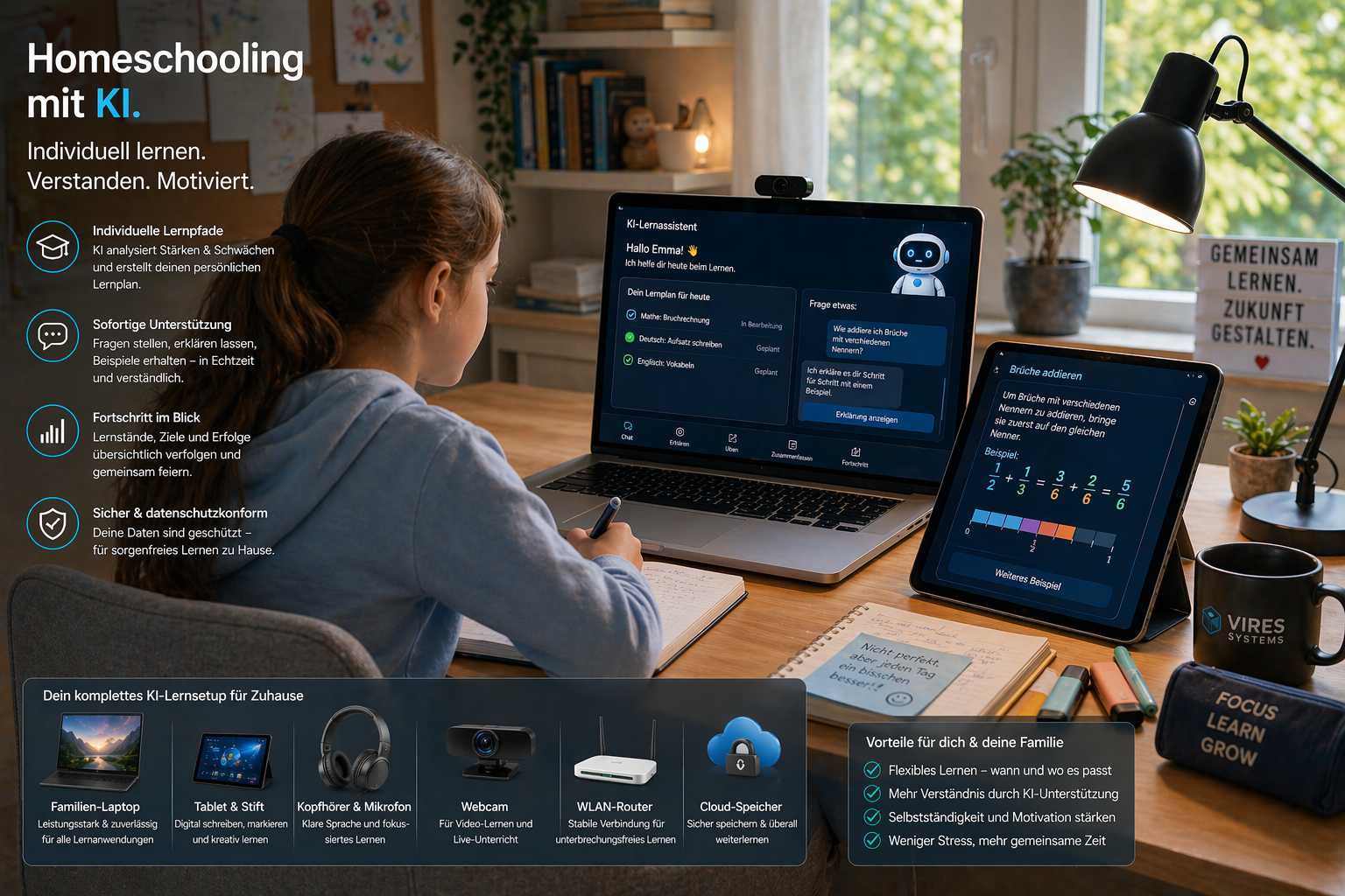 Im Homeschooling ist weniger oft mehr. Die VIRES-Logiken brauchen zu Hause vor allem eine stabile Kernkombination aus Familiengerät, ruhiger Audio-Lösung, Lernfläche und klarer Struktur für Eltern und Kind.