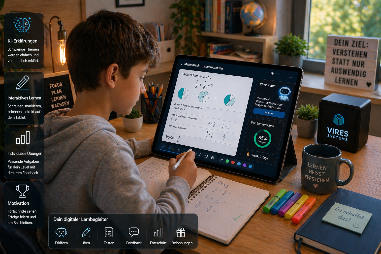 Das Hauptgerät bündelt Lernpläne, Aufgaben, kindgerechte KI-Dialoge, Vorlesefunktionen und sichere Profile.