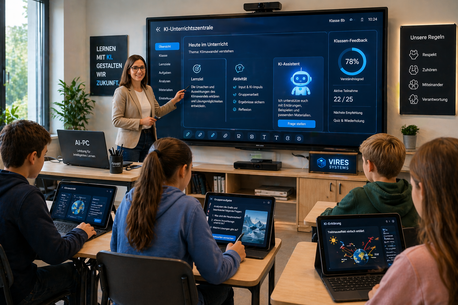 Ein moderner AI-PC oder leistungsfähiges Lehrer-Notebook bündelt Planung, Live-Hilfen, Tafelsteuerung und Unterrichtsdokumentation.