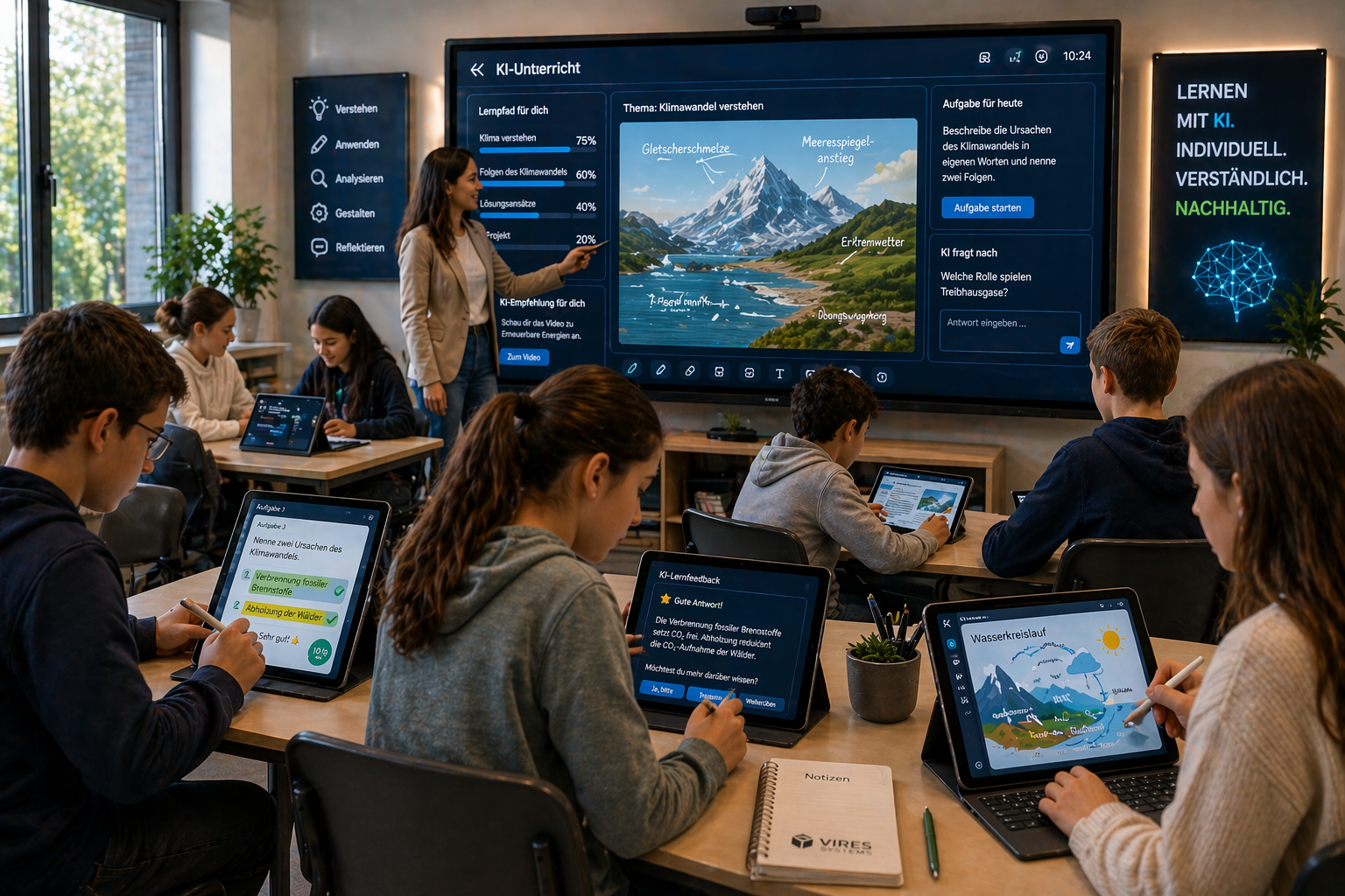 Schule mit KI wird als ruhige Ergänzung zum Unterricht gezeigt, nicht als Ersatz für Schule oder Lehrkräfte.
