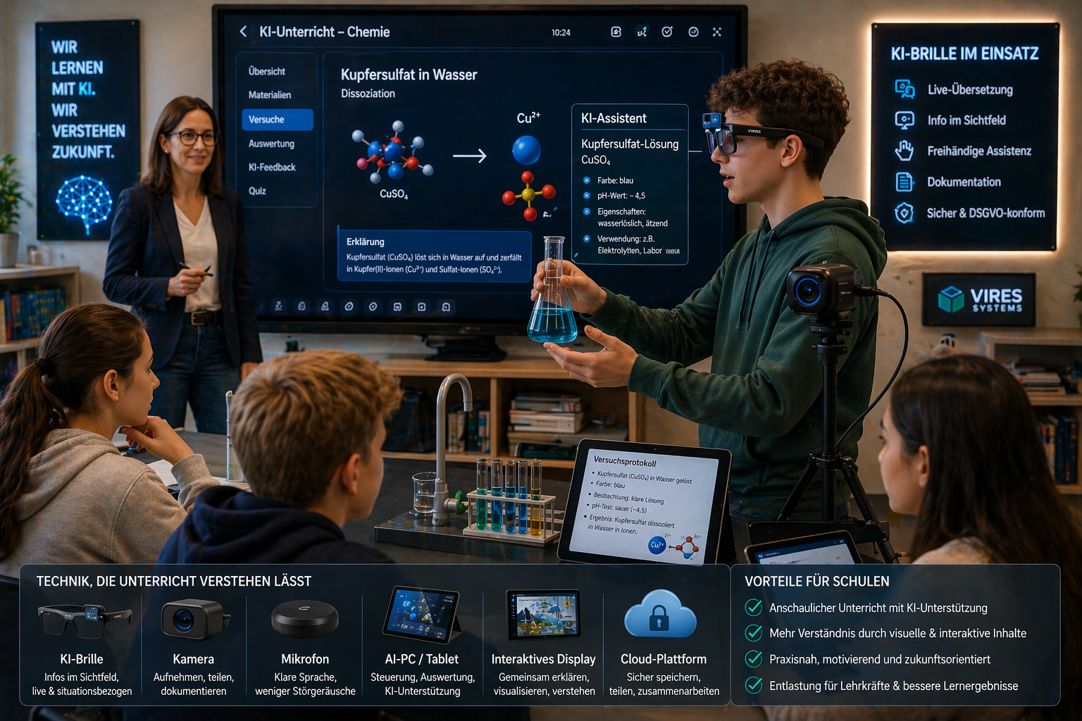 Damit Schule mit KI nicht nur eine Idee bleibt, braucht es neben den VIRES-Logiken eine klare Gerätestruktur im Klassenraum. Entscheidend ist nicht Maximaltechnik, sondern eine sinnvolle Kombination aus Lehrerplatz, Schülergeräten, Anzeige und Audio.